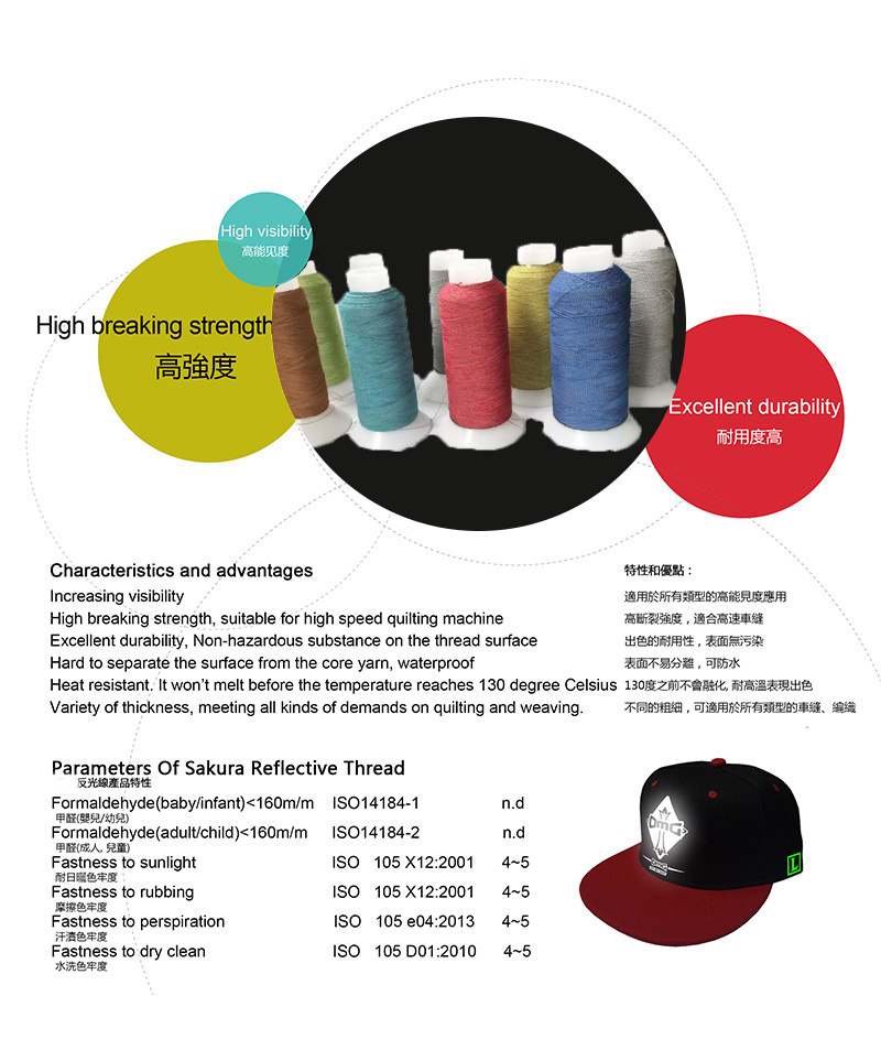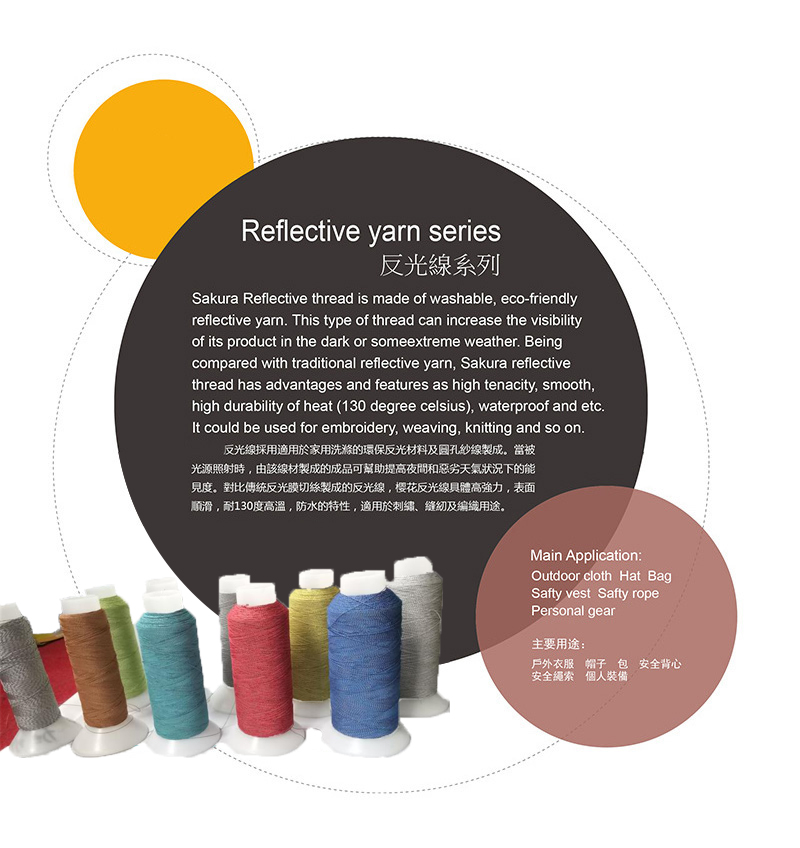 苏州华美反光线采用适用于家用洗涤的环保反光材料及圆孔纱线制成。当被光源照射时,由该线材制成的成品可帮助提高夜间和恶劣天气状况下的能见度。对比传统反光膜切丝制成的反光线,华美反光线具体高强力,表面顺滑,耐130度高温,防水的特性,适用于刺绣、缝纫及编织用途。