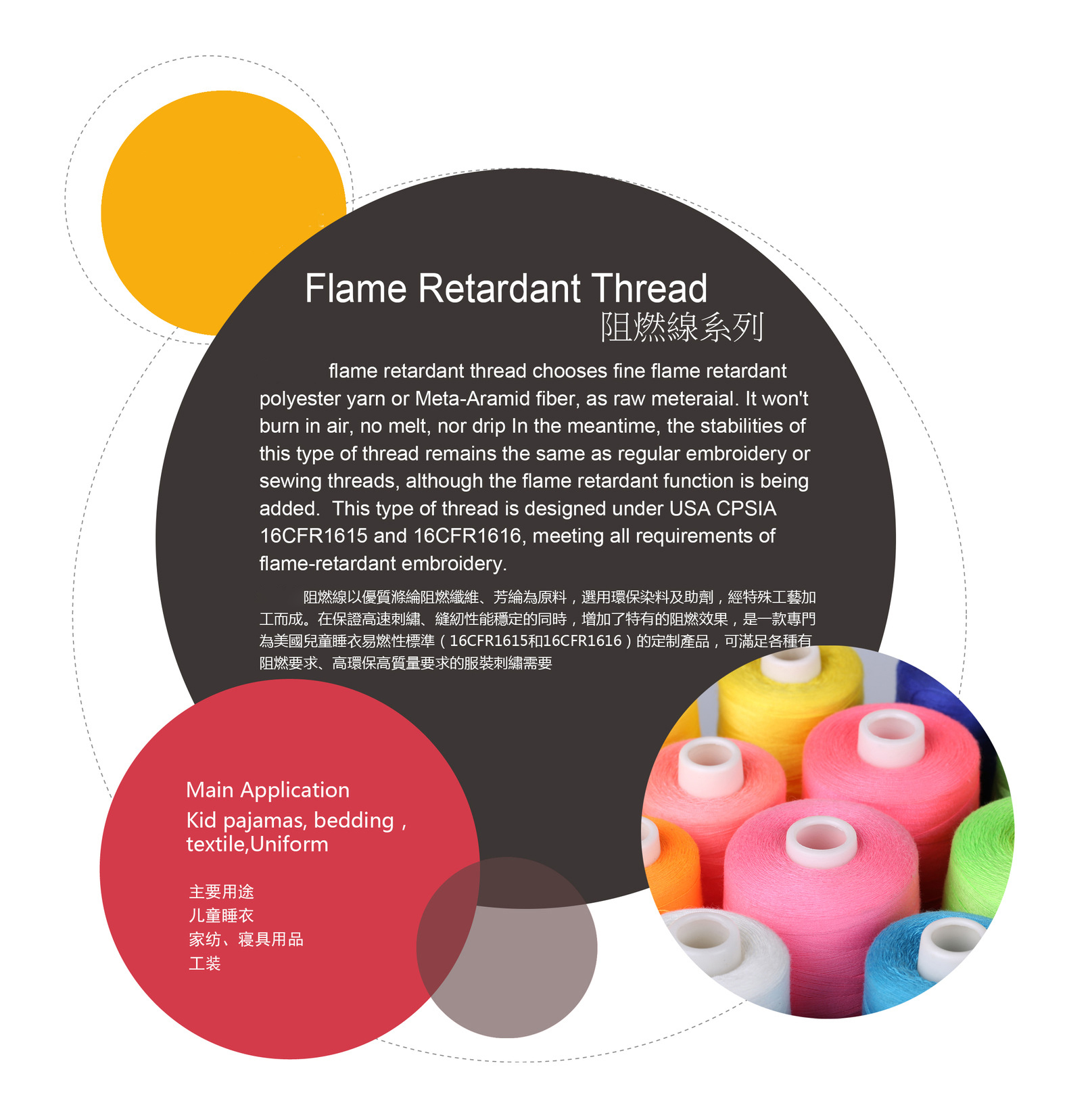 苏州华美阻燃线以优质涤纶阻燃纤维、芳纶为原料,选用环保染料及助剂,经特殊工艺加工而成。在保证高速刺绣、缝纫性能的同时,增加了其特有的阻燃效果,是一款专门为美国儿童睡衣易燃性标准(16CFR1615和16CFR1616)的定制产品,可满足各种有阻燃要求、高环保高质量要求的服装刺绣需要。